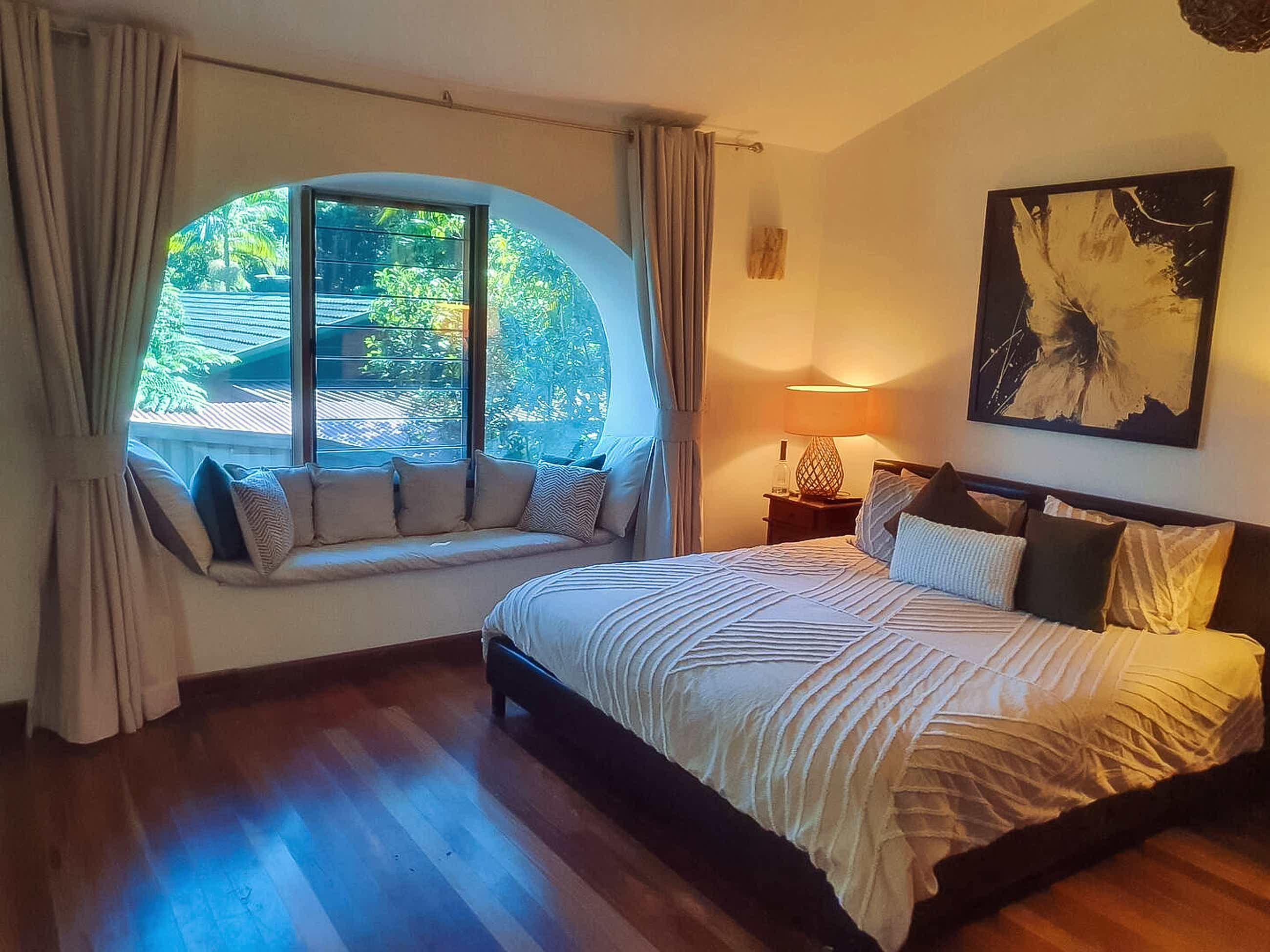This beautiful home is a peaceful sanctuary nestled amongst the trees, a perfect place to unwind either by the pool, or amongst the unique decor of this home. Come and unwind at this tropical location, with a stunning inground swimming pool. 5 great sized bedrooms with 4 beautiful bathrooms & 3 giant baths, 3 of the 5 bedrooms are ensuited. you can separate up and downstairs if 2 families wish to share. You will feel right at home in this space. Suitable for 2 families or up to 5 couples.