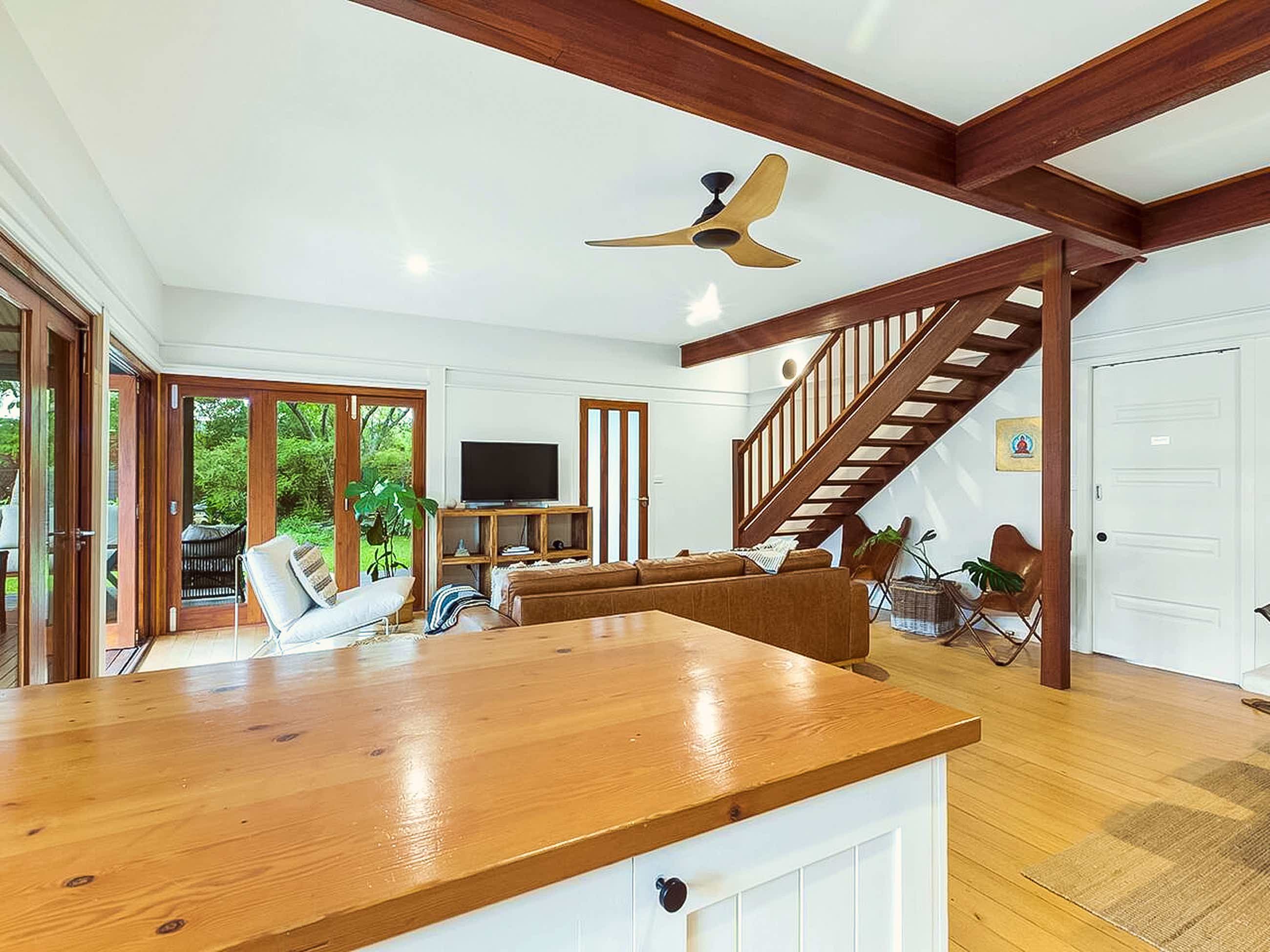A beautiful garden oasis , 1 minute until your feet are in the sands of Tallow beach. Relax after a day exploring our beautiful area in the covered wrap around deck. Light and spacious living/dining area with bi-fold doors opening onto a covered deck & BBQ area. There are 3 bedrooms with air conditioning and new ceiling fans. There are two bathrooms, one upstairs and one downstairs. Well-equipped main kitchen & fenced garden with 2 parking spots.