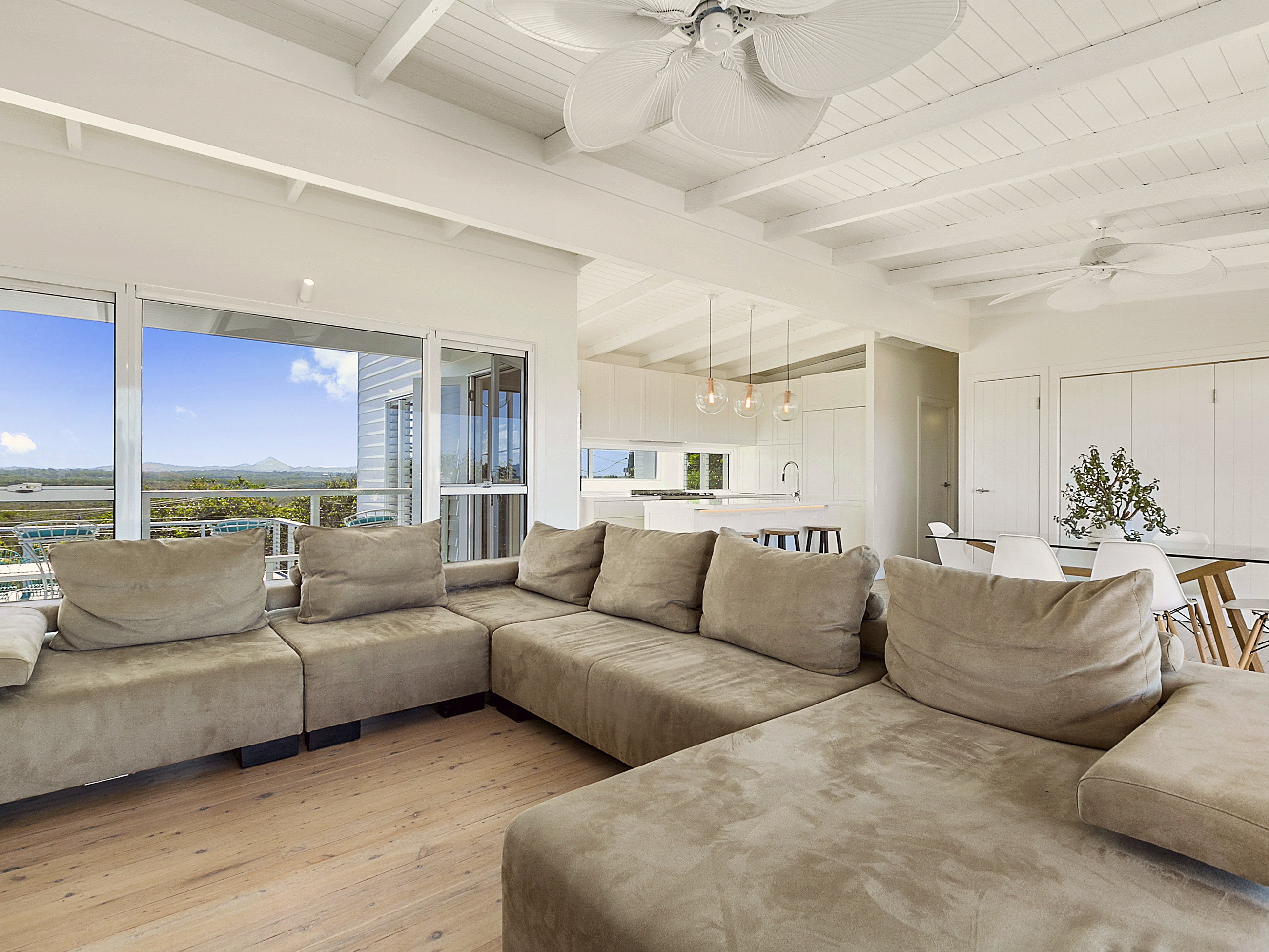 A coastal interior, with 4 bedrooms, 3.5 bathrooms and tropical garden and swimming pool. Breathtaking coastal and hinterland views from the living rooms, master bedroom, and deck. With a very relaxed property floor plan and large outdoor living areas, you can enjoy both the sunrise and sunset. This Peregian Beach getaway has 4 bedrooms, 2 King sized beds, and 2 rooms with a cot in each. This may be modified on request. Equipped with all the kitchen necessities and appliances. Sleeps a maximum of 6 people. Upstairs exhibits open living and dining, with master bedroom and spacious ensuite. Downstairs has a second TV/living space and kitchenette, and 3 bedrooms. The master bedroom downstairs has its own ensuite, with comfy king bed. The other 2 bedrooms have a cot in them. The home has air conditioning and fans throughout. The home exhibits a tropical environment and spacious outlay with open dining, kitchen and living area, and multiple undercover decks.